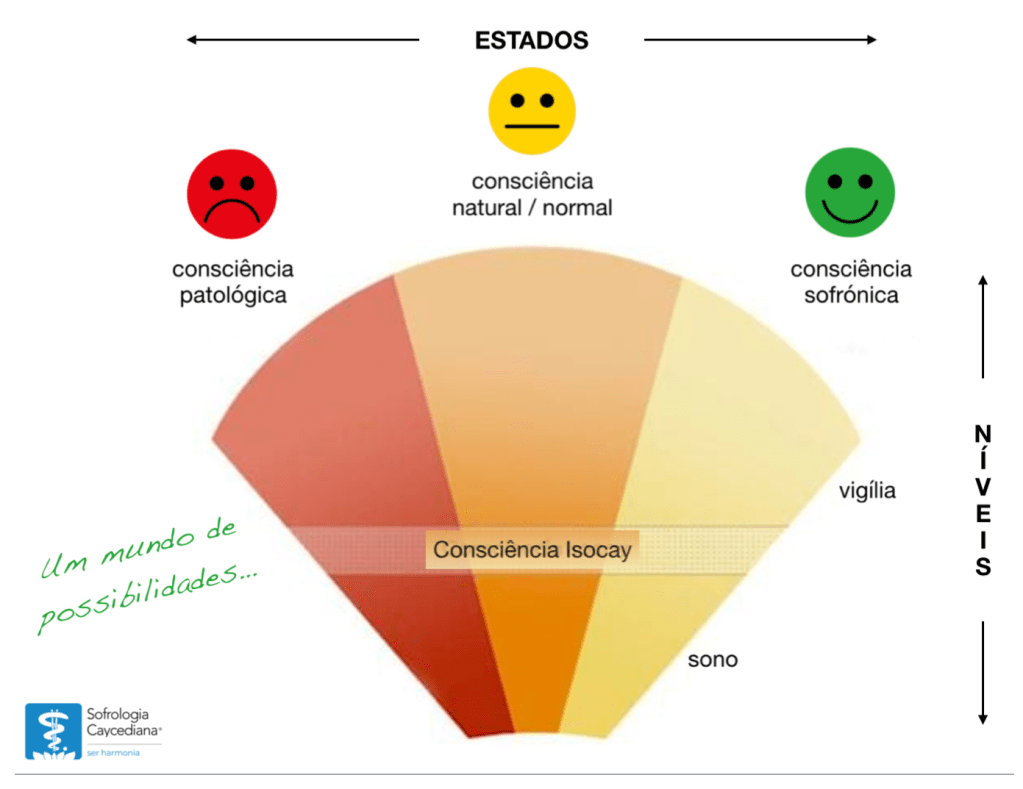 Os níveis de consciência são: vigília desperta (quando estamos acordados, e onde predominam as ondas beta), nível de consciência Isocay (também com ondas beta mas com mais ondas alfa – é aqui que a sofrologia opera) e o sono (com mais ondas teta e delta).